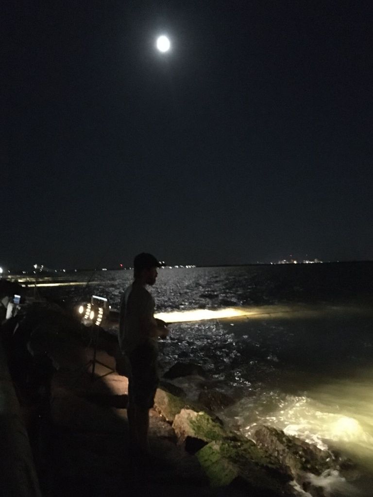 October is one of my favorite months to fish on the Texas coast. Cooler air and water temperatures seem to invigorate one’s soul. The unbearable heat of summer has for the most part disappeared. The fish become more active with the cooler water temps and autumn breezes. One of my favorite things to do is fish under a harvest moon using my can lights to attract bait fish and speckled trout. Here is a pic from the Texas City Dike of that scenario.